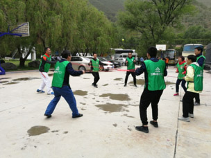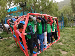 鼓动人心:一个大鼓,把鼓的四周拴上16根绳子,每根绳子由一个人牵着,在鼓上放一个球,然后16人颠球,看哪一组一次颠得多,颠得多者为胜。这个项目全体学员取长补短、团结协作完成共同目标能力,培养教师不怕挫折、不断进取,争创佳绩的意识,感受互相鼓励对完成任务的积极作用